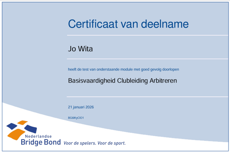 Jo Wita, gaat ons groepje wedstrijdleiders versterken. Behalve, dat hij in de afgelopen weken het NBB-Rekenprogramma onder de knie heeft gekregen, Heeft hij zich via de BridgeBond verder bekwaamd in het organiseren en arbitreren van bridgedrives.