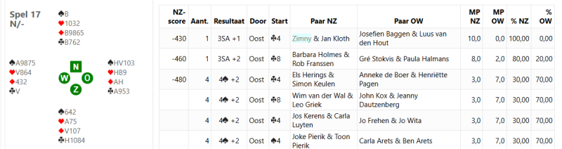 We hebben 13 paren in één lijn en dus helaas een stilzit. Eén slem wordt gevonden door Jo en Jo:
