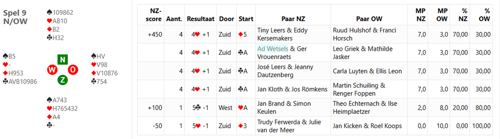 Op spel 9 ga je als OW slechts eentje down in 5 klaver. Bieden dus