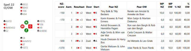 Astrid Brouwers & Henriëtte Pagen winnen in de A- lijn met 61,25%. Jan van den Brand en Simon Keulen in de B- lijn met 61,81% en Jeanny Dautzenberg & Ger Vrouenraets in de C- lijn met 71,58%.