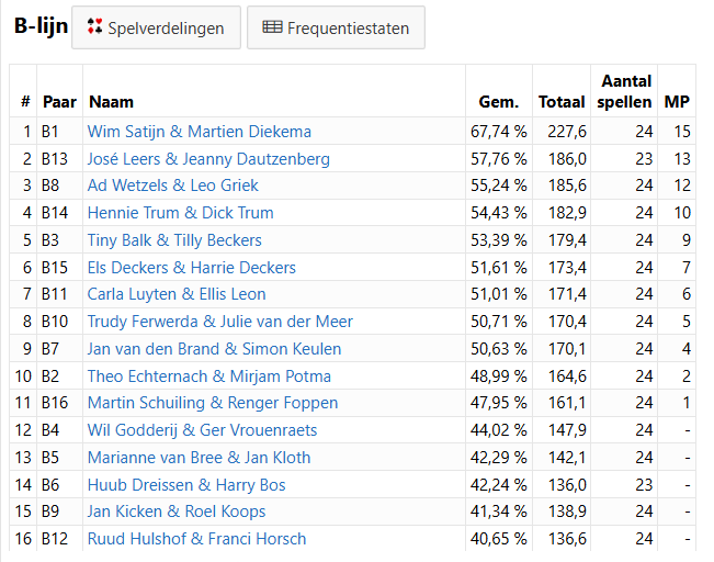 Martin Diekema & Wim Satijn winnen de B- lijn met 67,74%.