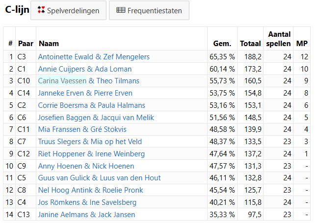 Antoinette Ewald & Zef Mengelers zijn de winnaars van de C- lijn met 65,35%.